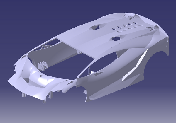 Le corps est le plus complexe. En effet, il s'agit d'un travail complètement réalisé en surfacique. Les courbes et les surface sont créées à partir de points dont les coordonnées sont mesurées précisément pour assurer une similarité entre la maquette 3D et le modèle réel.