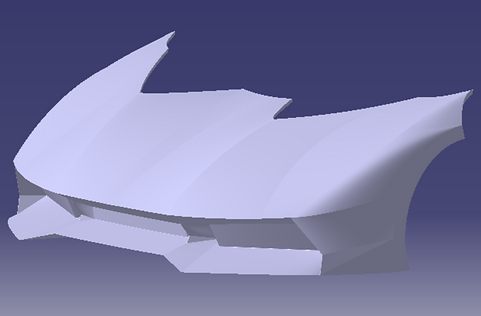 Le capot a été fait principalement en surfacique. On a créé des "coques épaisses". Le principe est de créer les surfaces extérieures et celles intérieures, puis celles qui les lient. On ferme ensuite l'assemblage à partir de ces surfaces en utilisant les fonctions "Limite" et "Remplissage". On remplit finalement l'assemblage global en volumique. Cela nous donne :